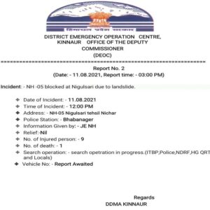 हिमाचल प्रदेश के किन्नौर जिले में रेकांगपियो-शिमला राष्ट्रीय राजमार्ग पर एक पहाड़ी से चट्टान गिरने से एक बस समेत कुछ वाहनों के उसकी चपेट में आने और 30 से ज्यादा लोगों के मलबे में दबने की आशंका है। प्रधानमंत्री नरेंद्र मोदी और केद्रीय गृहमंत्री अमित शाह ने हिमाचल के मुख्यमंत्री जयराम ठाकुर से बात की और स्थिति पर जानकारी ली। शाह ने ITBP के DG से भी बात की।