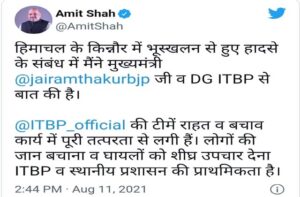 किन्नौर के निगुलसरी में नैशनल हाईवे-05 पर हुए भूस्खलन के चलते सवारियों से भरी एक बस व कुछ कारों के दबने की घटना पर पीएम मोदी, गृह मंत्री अमित शाह व भाजपा राष्ट्रीय अध्यक्ष जेपी नड्डा ने ट्वीट के माध्यम से भूस्खलन प्रभाविताें के प्रति संवेदनाएं प्रकट करते हुए हरसंभव मदद करने की बात कही है।