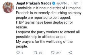 पीएम ने मुख्यमंत्री जयराम ठाकुर को किन्नौर में भूस्खलन के मद्देनजर जारी बचाव अभियान में हरसंभव मदद का आश्वासन दिया है।जेपी नड्डा ने ट्वीट के माध्यम से कहा है कि हिमाचल प्रदेश के किन्नौर जिले में भूस्खलन बेहद परेशान करने वाला है क्योंकि कई लोगों के फंसे होने की खबर है। बचाव के लिए ITBP की टीमों को लगाया गया है। मैं पार्टी कार्यकर्ताओं से अनुरोध करता हूं कि प्रभावित क्षेत्रों में हर संभव मदद करें। मैं लाेगाें की भलाई के लिए प्रार्थना करता हूं।