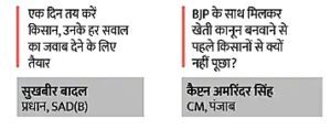 अगले वर्ष होने वाले विधानसभा चुनावों को लेकर पंजाब में राजनीति गर्माने लगी है। पंजाब में सबसे बड़ा मुद्दा केंद्र के खेती सुधार कानून व उसका विरोध कर रहे किसान हैं। इसका बड़ा कारण पंजाब की 70% आबादी का प्रत्यक्ष या अप्रत्यक्ष तौर पर खेतीबाड़ी से जुड़ा होना है। इसको लेकर अब शिरोमणी अकाली दल (SAD) बादल के प्रधान व पूर्व डिप्टी सीएम सुखबीर बादल और कांग्रेस सरकार के CM कैप्टन अमरिंदर सिंह आमने-सामने हो गए हैं। सुखबीर ने कहा कि मेरी पूरी लीडरशिप किसानों का जवाब देने को तैयार है। वहीं, कैप्टन ने पलटवार करते हुए कहा कि BJP के साथ मिलकर खेती कानून जबरन लागू कराने से पहले अकाली दल ने किसानों को क्यों नहीं पूछा?।