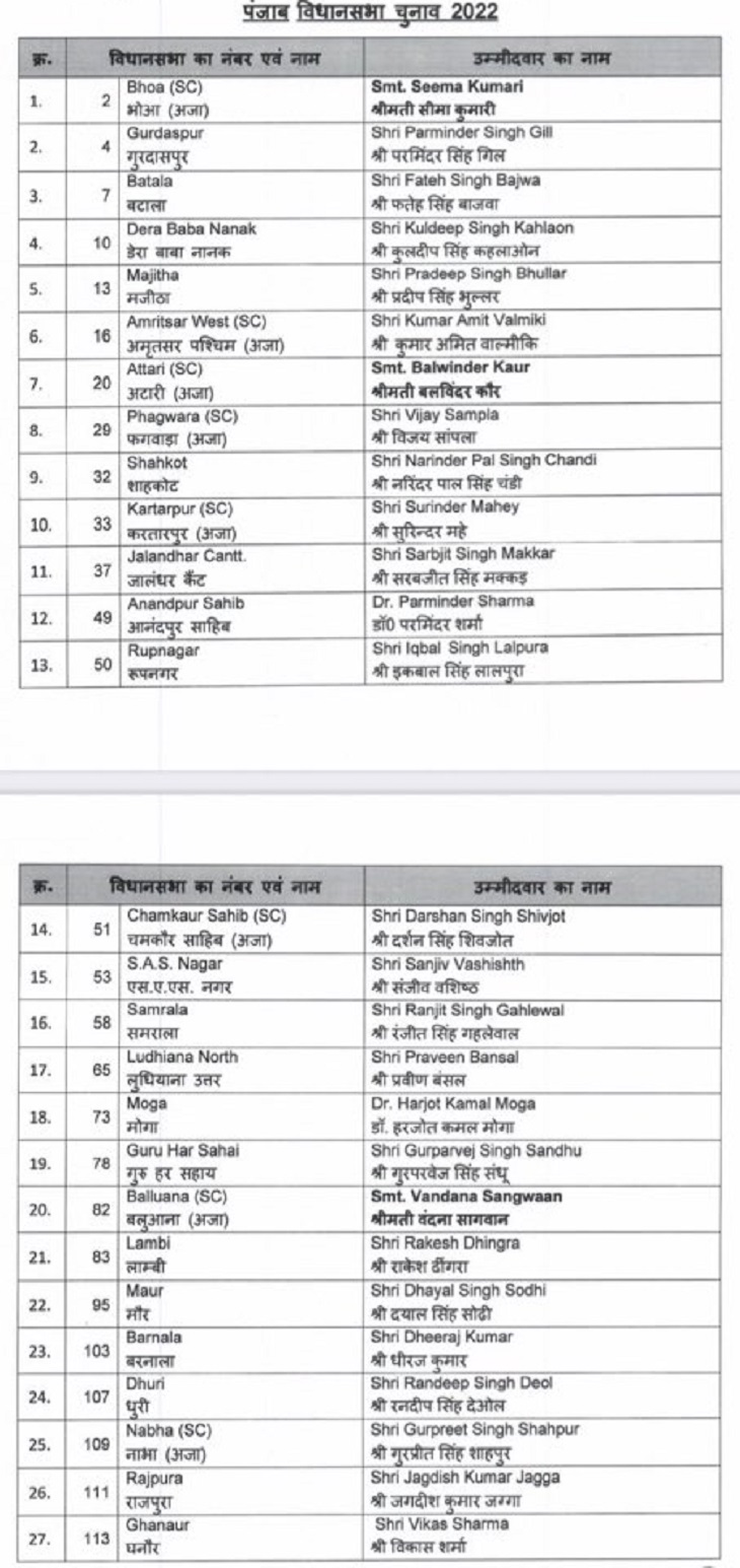 भाजपा ने पंजाब के लिए अपने 27 नए उम्मीदवारों का ऐलान कर दिया है। इसमें बड़े चेहरों में बटाला से कांग्रेस से आए मौजूदा विधायक फतेहजंग बाजवा, फगवाड़ा से पूर्व केंद्रीय राज्य मंत्री विजय सांपला, मोगा से कांग्रेस से आए विधायक हरजोत कमल को टिकट दी गई है। रोपड़ से इकबाल सिंह लालपुरा चुनाव लड़ेंगे।