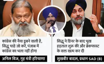 पंजाब कांग्रेस के नेता नवजोत सिद्धू के लखीमपुर खीरी मौन व्रत पर अब विरोधी खूब तंज कस रहे हैं। पंजाब से लेकर हरियाणा के मंत्री भी उन्हें नहीं बख्श रहे। हरियाणा के गृह मंत्री अनिल विज ने तो यहां तक कहा कि सिद्धू परमानेंट मौन धारण कर लें तो देश और कांग्रेस को शांति मिल जाएगी। वहीं शिरोमणि अकाली दल (SAD) बादल के प्रधान सुखबीर बादल इसे ड्रामेबाजी बता रहे हैं। सुखबीर बोले कि सिद्धू ने डिनर के बाद भूख हड़ताल शुरू की और ब्रेकफास्ट के समय इसे तोड़ दिया।