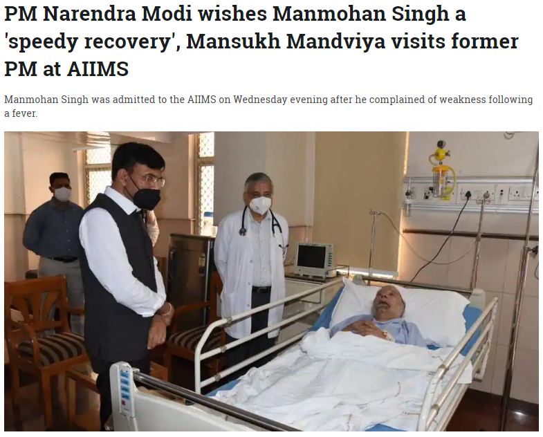 - वेबसाइट के मुताबिक, ये फोटो केंद्रीय स्वास्थ्य मंत्री मनसुख मंडाविया की पूर्व प्रधानमंत्री डॉ. मनमोहन सिंह से मुलाकात की है। स्वास्थ्य मंत्री गुरुवार को AIIMS में डॉ. मनमोहन सिंह से मिलने पहुंचे और उनका इलाज कर रहे डॉक्टरों से उनके स्वास्थ्य के बारे में जानकारी ली।