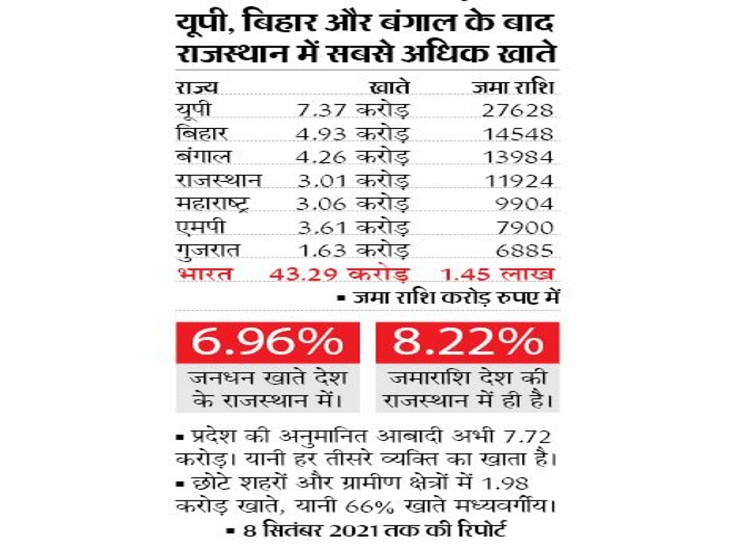 यूपी, बिहार व बंगाल के बाद यह सबसे अधिक है। विशेषज्ञों का मानना है कि बैंकों जमा कराने का सिलसिला बढ़ता जा रहा है क्योंकि, बचत हमारी परंपरा भी रही है। पहले घरों तक सीमित थी, अब बैंक खाते खुलने आसान हुए तो वहां पहुंचने लगी है। नोटबंदी के बाद इसमें तेजी आई है। लोग बैंकों खासकर सार्वजनिक क्षेत्र पर ज्यादा भरोसा करने लगे हैं। देश भर में 55% जनधन खाते महिलाओं के हैं।