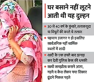 लुटेरी दुल्हन ने पूरा गिरोह बना लिया था। यह गिरोह पहले 30 से 40 साल के कुंवारे, तलाकशुदा या उन लोगों को ढूंढता था, जिनकी पत्नी की मौत हो चुकी हो। फिर उनसे रिश्ता तय करके धार्मिक जगह पर शादी कर लेते। घर लौटने के एक हफ्ते बाद लुटेरी दुल्हन झगड़ा शुरू कर देती थी। वह घर छोड़ने व पुलिस में केस करने की धमकी देती थी। इसके बाद गिरोह के पुरुष साथी की एंट्री होती, जो खुद को दुल्हन का रिश्तेदार बताता। परिवार के बीच समझौते की बात चलाई जाती।