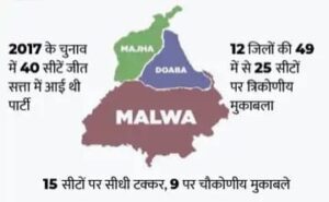 दोआबा में पंजाब विधानसभा की 23 सीटें हैं और यहां भी कांग्रेस के प्रति वोटरों में नाराजगी है। 2017 में यहां 23 में से 15 सीटें जीतने वाली कांग्रेस इस बार सिंगल डिजिट में सिमट सकती है। पिछले चुनाव में BJP को यहां सिर्फ एक और अकालियों को 5 सीटें मिली थी। इस बार दोआबा में कांग्रेस को छोड़कर बाकी सभी दलों की सीटें बढ़ने के चांस हैं। आम आदमी पार्टी को लेकर यहां अंडर करंट है।