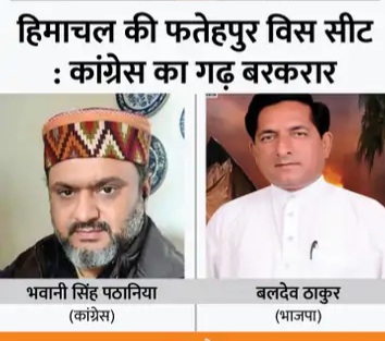 फतेहपुर विधानसभा सीट पर कांग्रेस के भवानी सिंह पठानिया और भाजपा उम्मीदवार बलदेव ठाकुर के बीच आखिरी डेढ़ घंटे से पहले तक कांटे का मुकाबला रहा और उसके बाद पठानिया ने 5789 वोट से जीत दर्ज की।30 अक्टूबर को मतदान में फतेहपुर विधानसभा सीट पर कुल 57095 लोगों ने वोट दिया था। इसमें से 24449 वोट लेकर कांग्रेस के भवानी सिंह पठानिया ने जीत दर्ज की। दूसरे नंबर पर रहे भाजपा के बलदेव ठाकुर को 18660 वोट मिले।
