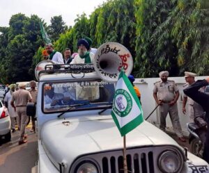 शनिवार को जालंधर में गाड़ियों पर लाउडस्पीकर लगाकर कैबिनेट मंत्री परगट सिंह का घर घेरने पहुंचे भारतीय किसान यूनियन राजेवाल के सदस्य।