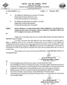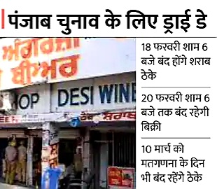 पंजाब में विधानसभा चुनाव को लेकर शराब ठेके 48 घंटे बंद रहेंगे। पंजाब में 18 फरवरी शाम 6 बजे से 20 फरवरी शाम 6 बजे तक शराब बिक्री पर रोक रहेगी। पंजाब में 20 फरवरी को मतदान होना है। जिस वजह से यह आदेश दिए गए हैं। इसके अलावा 10 मार्च को पंजाब में मतगणना होनी हैं। उस दिन भी ड्राई डे रहे। पंजाब के मुख्य चुनाव अफसर डॉ. एस. करूणा राजू ने इस संबंध में गृह विभाग और एक्साइज सचिव को पत्र लिखकर आदेश सख्ती से लागू करने को कहा है।