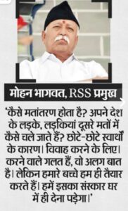 ‘कैसे मतांतरण होता है? अपने देश के लड़के, लड़कियां दूसरे मतों में कैसे चले जाते हैं? छोटे-छोटे स्वार्थों के कारण। विवाह करने के लिए। करने वाले गलत हैं, वो अलग बात है, लेकिन हमारे बच्चे हम नहीं तैयार करते। हमें इसका संस्कार घर में देना पड़ेगा।‘